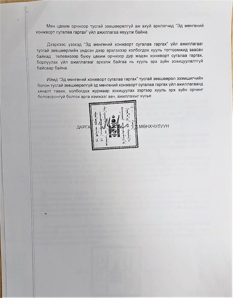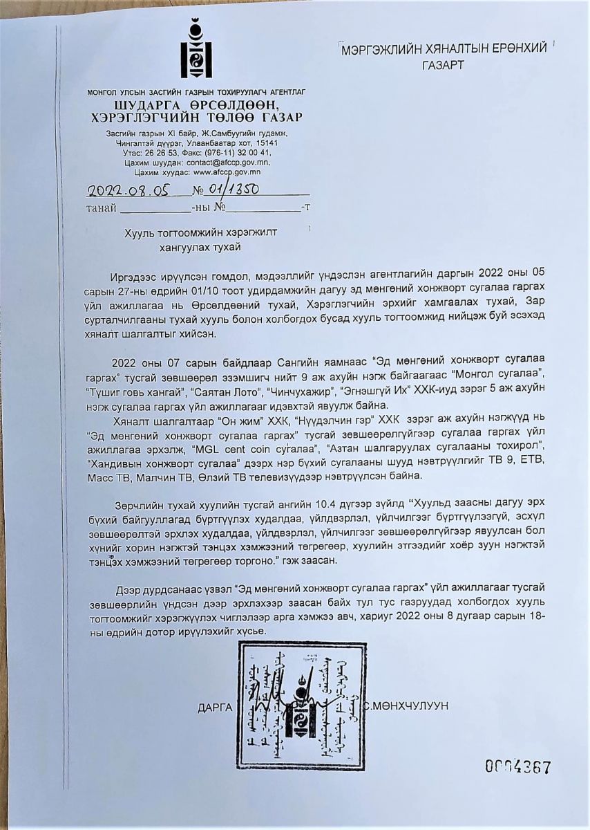 “Он жим” ХХК, ”Нүүдэлчин гэр” ХХК зэрэг аж ахуйн нэгжүүд нь ”эд мөнгөний хонжворт сугалаа гаргах” тусгай зөвшөөрөлгүйгээр үйл ажиллагаа эрхэлж, улмаар сугалааны шууд нэвтрүүлгийг телевизүүдээр нэвтрүүлж байсан ба тухайн аж ахуй эрхлэгчдийн зөрчлийг таслан зогсоох талаар ШӨХТГ-ын даргын 2022.08.05-ний өдрийн 01/1350 дугаартай албан бичгээр Мэргэжлийн хяналтын Ерөнхий газарт “Хууль тогтоомжийн хэрэгжилтийг хангуулах тухай” хугацаатай албан бичгийг хүргүүллээ.