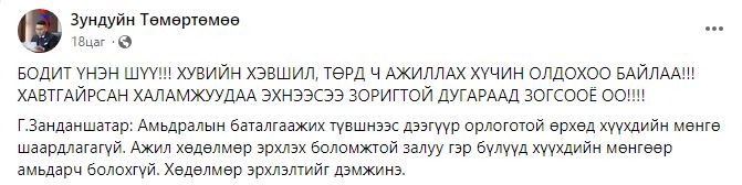Нийслэлийн засаг даргын орлогч З.Төмөртөмөө “Бодит байдал: Үнэн үгэнд бид дургүй болж!!! Зорилтот бүлгийн хүүхдүүддээ л өгөх хэрэгтэй байна. Боломжтой айлууд авах шаардлаггүй!!! Одоог хүртэл аваагүй айлууд их байгаа л юм байна шүү дээ!!!, БОДИТ ҮНЭН ШҮҮ!!! ХУВИЙН ХЭВШИЛ, ТӨРД Ч АЖИЛЛАХ ХҮЧИН ОЛДОХОО БАЙЛАА!!! ХАВТГАЙРСАН ХАЛАМЖУУДАА ЭХНЭЭСЭЭ ЗОРИГТОЙ ДУГАРААД ЗОГСООЁ ОО!!!! гэж өөрийн цахим хуудаснаа илэрхийлж.