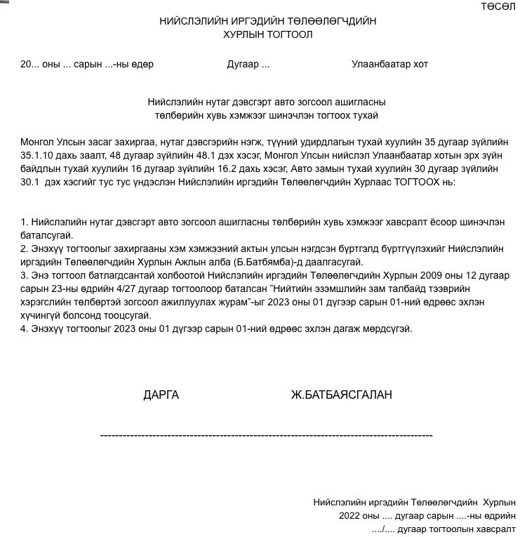 Уг тогтоолын төсөлд иргэдээс https://ulaanbaatar.mn/votes холбоосоор санал авч байна. Тус тогтоолын төсөлд нэмэлт санал өгөх бол ulaanbaatartrafficproject@gmail.com цахим хаяг руу илгээх боломжтой.