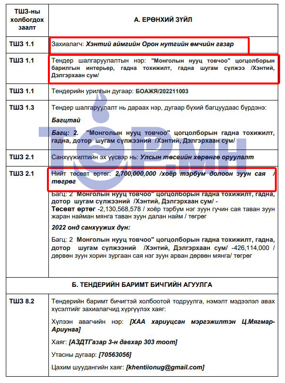 “Монголын нууц товчоо” цогцолборын интерьер, гадна тохижилт, гадна шугам сүлжээ 2.7 тэрбум төгрөгийн тендерийг Хэнтий аймгийн Орон нутгийн өмчийн газар захиалж, Байгаль орчин, аялал жуулчлалын яам тендер зарлажээ.