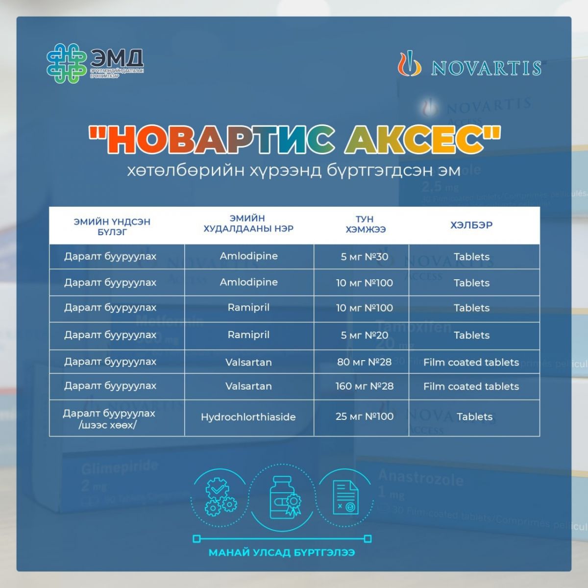 ЭМДЕГ, Швейцарийн "Новартис" компанитай хамтран олон улсад хүлээн зөвшөөрөгдсөн зүрх судас, чихрийн шижин, уушгины эмгэг болон хавдрын үед хэрэглэх 19 төрлийн эмийг ЭМД-ын шимтгэлээ төлсөн хүн бүрд ЭМД-ын сангаас 100 хувь хөнгөлөлттэй үнээр олгож байна.