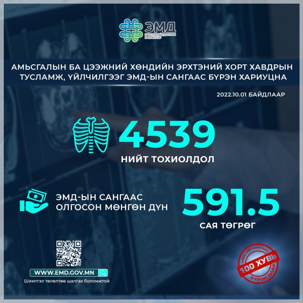 2022 оны эхний 10 сарын байдлаар энэхүү тусламж, үйлчилгээний 4539 тохиолдол бүртгэгдэж, ЭМД-ын сангаас 591.5 сая төгрөгийн санхүүжилт олгосон байна.
