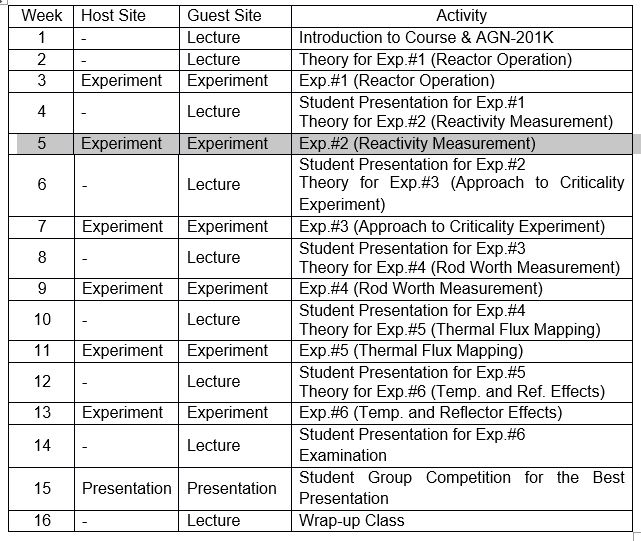 "Kyung Hee" Их Сургуулийн зүгээс нйтдээ 6 үндсэн реакторын физикийн туршилтыг хийхийг санал болгосон. Эдгээр туршилтууд нь цөмийн судалгааны реактор дээр хамгийн түгээмэл хийгддэг лабораторийн ажлууд болно.