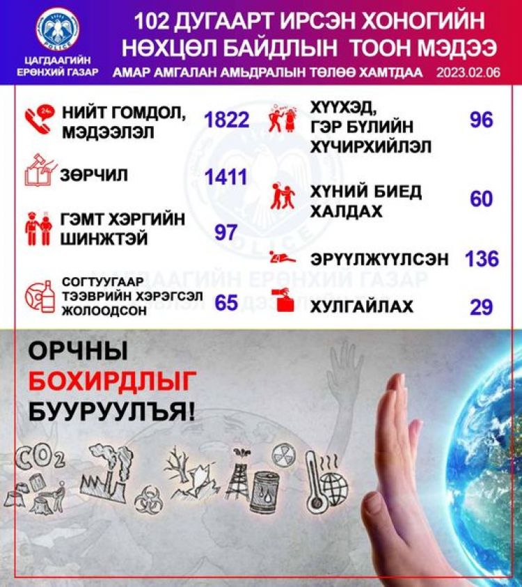 Цагдаагийн байгууллагын 102 дугаарын утсанд өчигдөр /2023.02.06/ нийт 1822 дуудлага иржээ. Үүнээс,