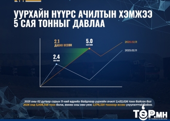 Тодруулбал 2025 оны 02 дугаар сарын 11-ний өдрийн байдлаар уурхайн ачилт 2,432,026 тонн байсан бол 2026 онд 5,008,346 тонн болж, өмнөх оны мөн үеэс 2,576,320 тонноор өссөн үзүүлэлттэй байна.