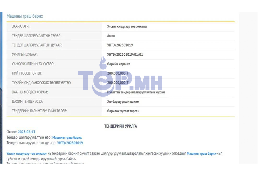 Тэгвэл улсдаа томоохонд тооцогдох Улсын нэгдүгээр төв эмнэлэг нь дотоод хэрэгцээнд ашиглах "Автомашины граш"-ийг 200 сая төгрөгөөр барих тендерийг хоёрдугаар сарын 13-ны өдөр зарлажээ.
