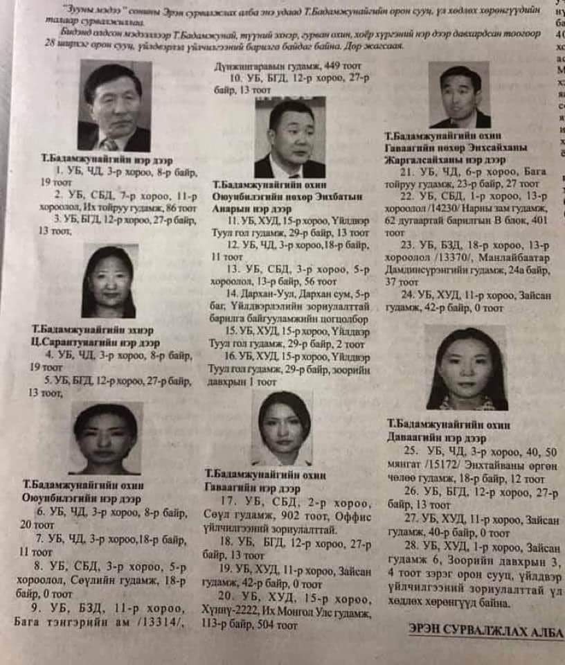 Т.Бадамжунай болон түүний эхнэр, гурван охин, хоёр хүргэний нэр дээр давхардсан тоогоор 28 ширхэг орон сууц, үйлдвэрлэл үйлчилгээний барилга байдаг байна. Эдгээрийг дурдвал,