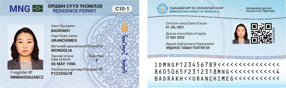 Тодруулбал, Оршин суух үнэмлэхийг олон улсын жишигт нийцүүлж, аяллын баримт бичгийн бүтэц, стандартыг хангасан NFC технологи, MRZone, QR код болон гадаадын иргэнд олгож буй F-register буюу дахин давтагдахгүй 13 оронтой дугаар бүхий оршин суух үнэмлэх (residence permit)-ийг 2023 оны 04 дүгээр сарын 01-ний өдрөөс олгож эхэллээ.