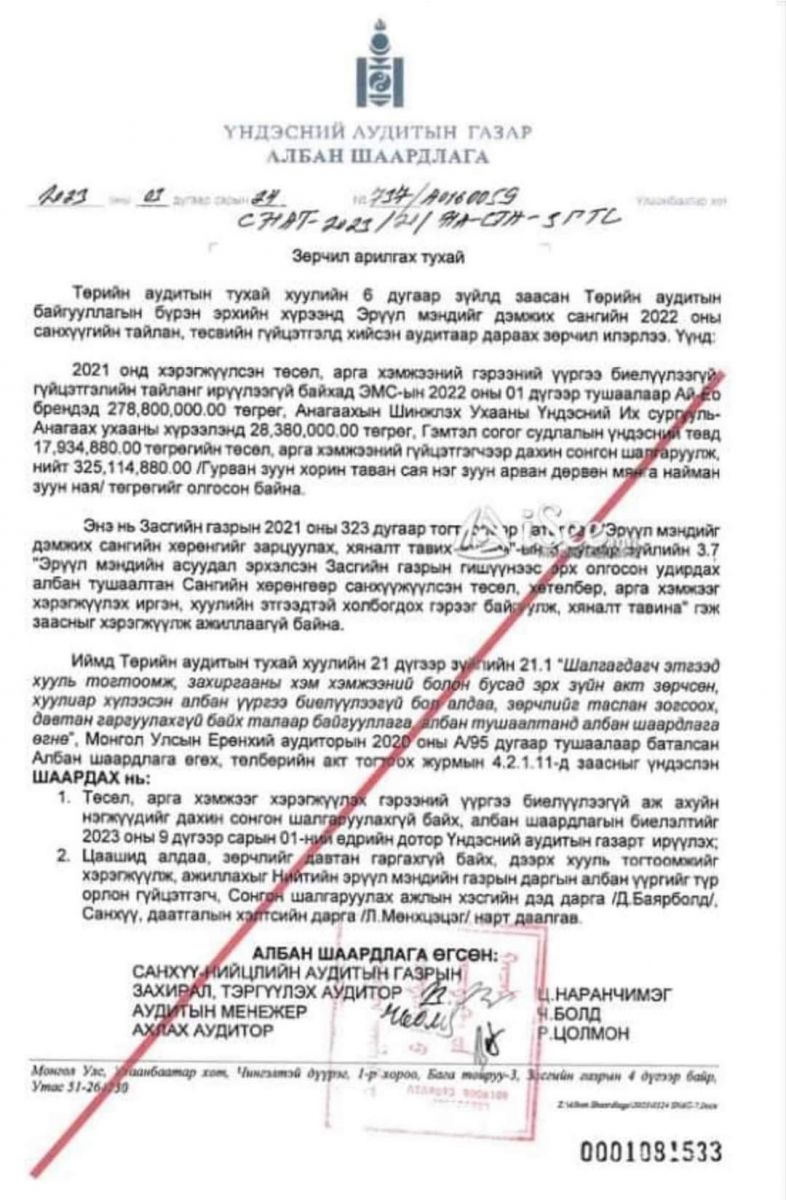 Энэ нь Засгийн газрын 2021 оны 323 дугаар тогтоолоор баталсан "Эрүүл мэндийг дэмжих сан"-гийн хөрөнгийг зарцуулах, хяналт тавих заалтыг зөрчсөн байна.