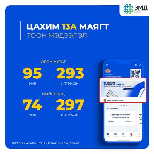 Энэ сарын 13-ны 21:00 цагийн байдлаар нийслэлийн 74 эрүүл мэндийн байгууллага 297 иргэнд, орон нутагт 95 эрүүл мэндийн байгууллага 293 иргэнд 13А маягтыг цахимаар үүсгэжээ.