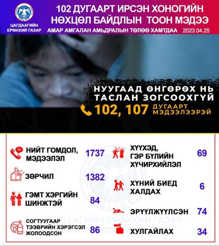 Цагдаагийн байгууллагын 102 дугаарын утсанд өчигдөр /2023.04.25/ нийт 1737 дуудлага, мэдээлэл иржээ. Үүнээс зөрчлийн шинжтэй 1382, гэмт хэргийн шинжтэй 84 дуудлага, мэдээлэл байна.