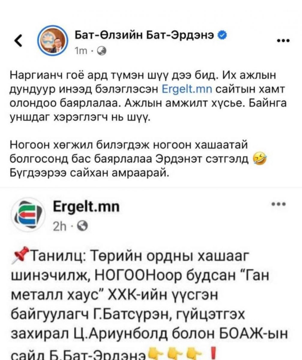 Тэгвэл ergelt.mn сайтад "ТАНИЛЦ: Төрийн ордны хашааг ногооноор будсан "Ган металл хаус" ХХК-ийн үүсгэн байгуулагч Г.Батсүрэн, Гүйцэтгэх захирал Ц.Ариунболд болон БОАЖ-ын сайд Б.Бат-Эрдэнэ" гэх материал нийтлэгджээ.