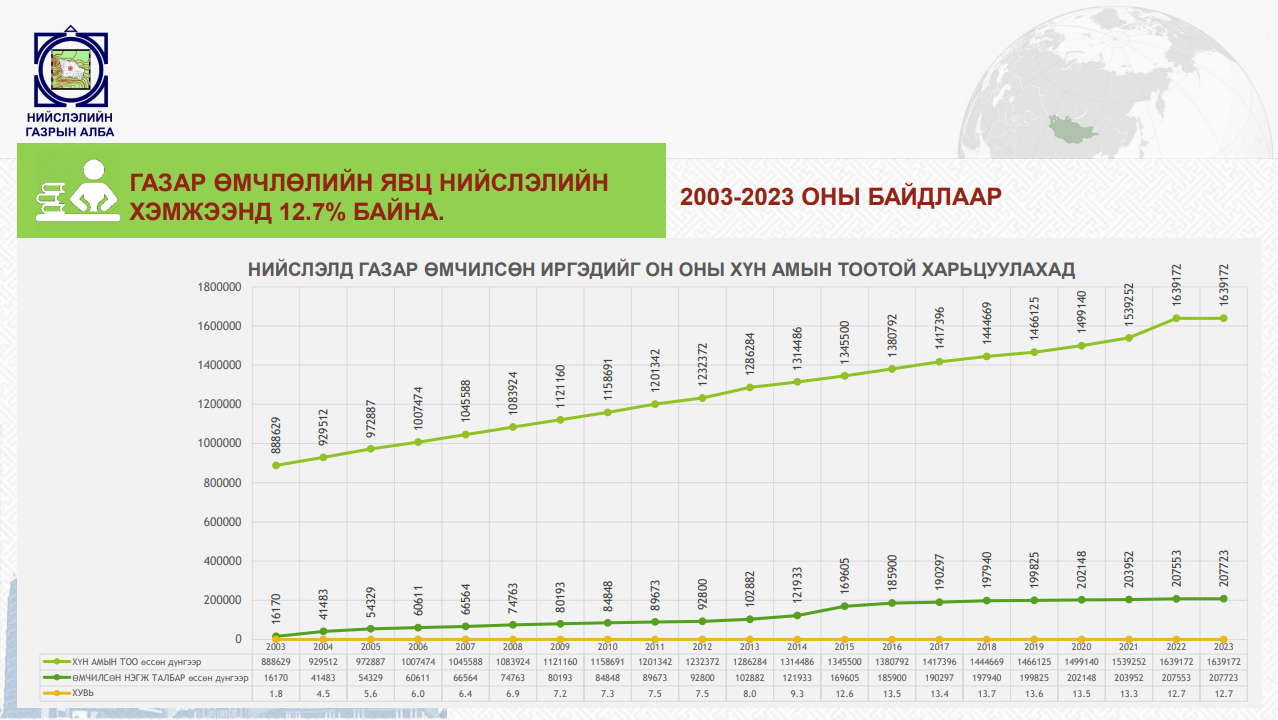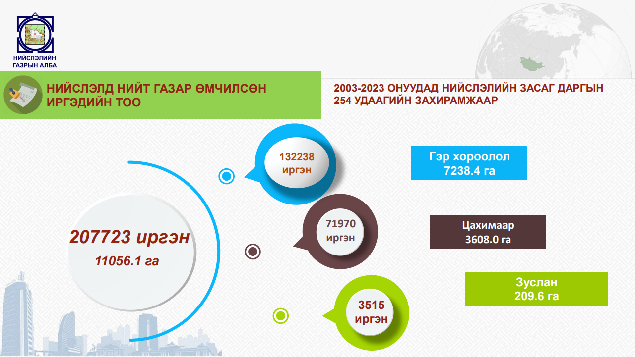 -Нийслэлд хийх бүтээн байгуулалтын ажлуудын газар чөлөөлөлтийг манай байгууллага хариуцан ажилладаг. Өөрөөр хэлбэл, нийгмийн хангамжийн болон авто зам, инженерийн шугам сүлжээний барилга байгууламжийг барихад шаардлагатай газрыг чөлөөлдөг. Улаанбаатар хот төвлөрөл ихтэй тул иргэдийн өмчилсөн газрыг харилцан тохиролцож, чөлөөлдөг гэсэн үг. Эзэмших эрхтэй газрын суурь үнийг бодохдоо Монгол Улсын Засгийн газрын 2018 оны 182 дугаар тогтоолоор бодож гаргадаг тул төлбөр нь харьцангуй бага байдаг. Харин өмчлөх эрхтэй газрыг зах зээл дэх ам метрийн үнийг мэргэжлийн байгууллагаар тогтоолгож, нөхөн олговрын үнийн дүнг гаргадаг. Тиймээс газар өмчлөх эрх нь эзэмших эрхээс илүү давуу талтай.
