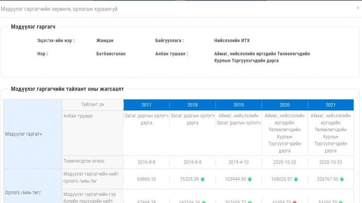 НИТХ-ын дарга Ж.Батбаясгалан нь 2016 оноос Нийслэлийн Засаг даргын орлогчоор ажилласан бөгөөд тухайн үеийн Хөрөнгө орлогын мэдүүлэгтээ өөрийн орлогыг 69 сая 869 мянга гэж мэдүүлж байсан бол 2021 онд 326 сая 767 мянга гэж мэдүүлсэн байдаг. Хотын даргын орлогчоор томилогдож байхдаа “Алтан хот” ББСБ-ын хувьцаатай байсан бол 2021 онд “Эрдэнэс Тавантолгой” ХК-ийн 1072 хувьцаанаас өөр хувьцаагүй гэж мэдүүлсэн байгаа юм.