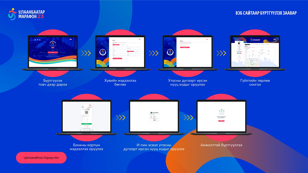 Эрүүл мэндийн гүйлт буюу 5000 метрийн зайд оролцогчид бүртгэл, хураамжийг онлайнаар хийж, дараах штабуудаас энгэрийн дугаараа авч, бүртгэлээ баталгаажуулна.