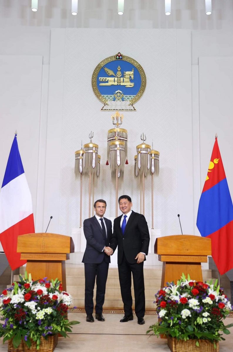 Монгол Улсын Ерөнхийлөгч Ухнаагийн Хүрэлсүхийн урилгаар Бүгд Найрамдах Франц Улсын Ерөнхийлөгч Эммануэл Макроны Монгол Улсад хийсэн төрийн айлчлалын хүрээнд талууд Хамтарсан тунхаглал гаргав.