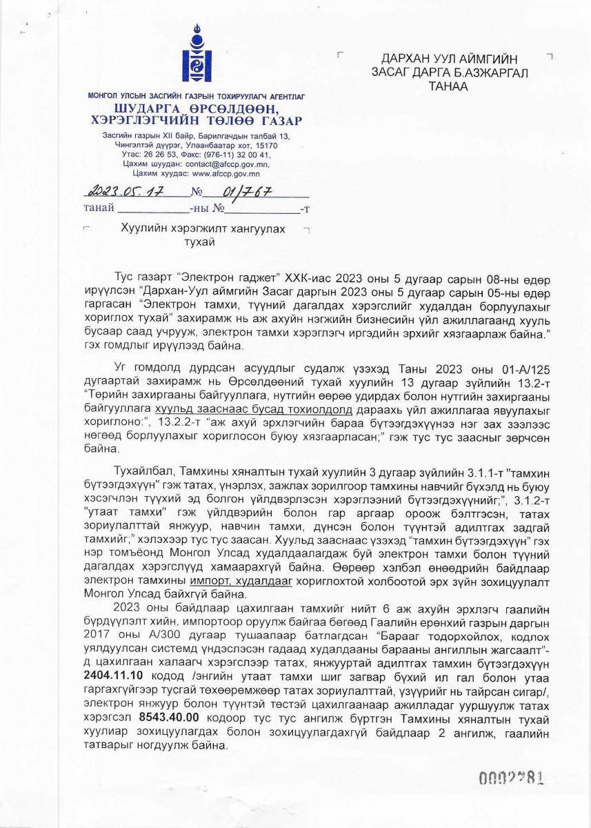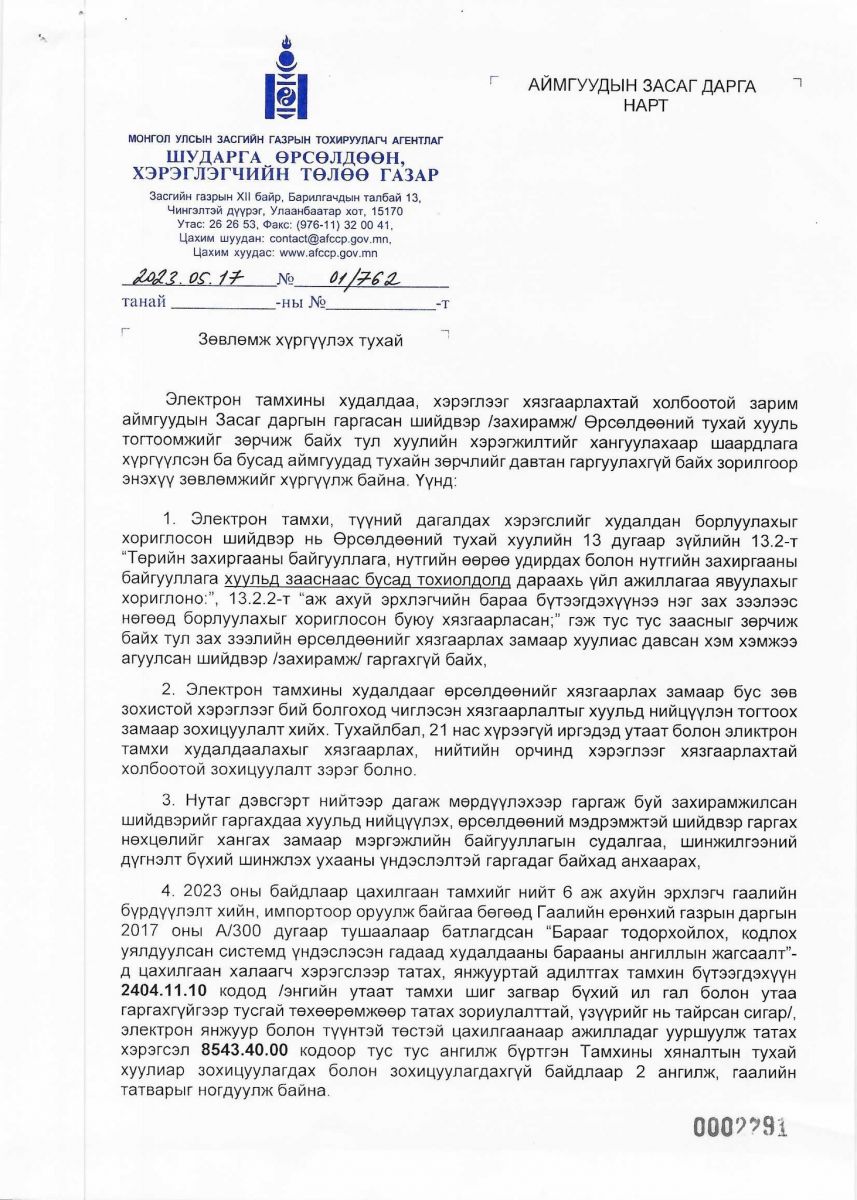 Электрон тамхины худалдаа, хэрэглээг хязгаарлахтай холбоотой зарим аймгуудын Засаг даргын гаргасан шийдвэр /захирамж/ Өрсөлдөөний тухай хууль тогтоомжийг зөрчиж байх тул хуулийн хэрэгжилтийг хангуулахаар шаардлага хүргүүлсэн ба бусад аймгуудад тухайн зөрчлийг давтан гаргуулахгүй байх зорилгоор энэхүү зөвлөмжийг хүргүүллээ.