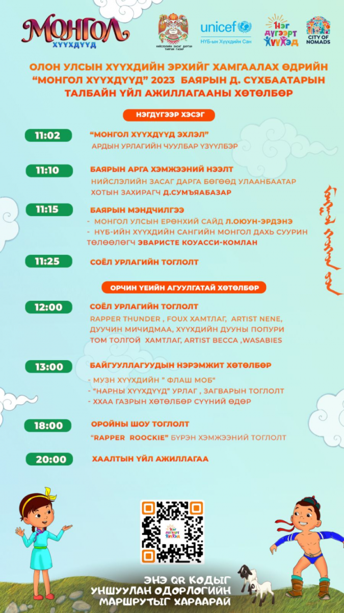 Хүүхдийн баяраар болох үйл ажиллагаа болон хөтөлбөрийн мэдээллийг доорх QR кодыг уншуулан аваарай.