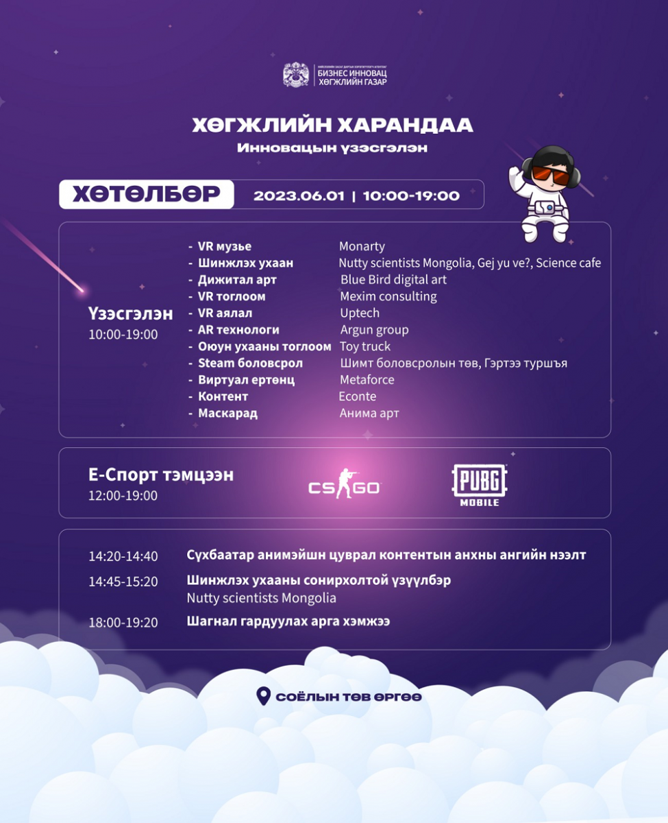 Танин мэдэхүй, инновацын үзэсгэлэнгийн үеэр шинжлэх ухааны сонирхолтой туршилт, үзүүлбэрүүдийг танилцуулж, AR, VR технологийн гайхамшиг, виртуал ертөнц /Meta/-ийн гайхамшгийг мэдрүүлнэ. Мөн сэтгэхүй хөгжүүлэх тоглоом, Ангарагаас ирсэн аяган бялууг амтлах, Мобайл PUBG, CSGO шилдэг багуудын тэмцээнийг газар дээрээс нь үзэх зэрэг олон сонирхолтой арга хэмжээ болох бөгөөд урилгаар caster Tuvshuun, Chinzo нар хүрэлцэн ирнэ.