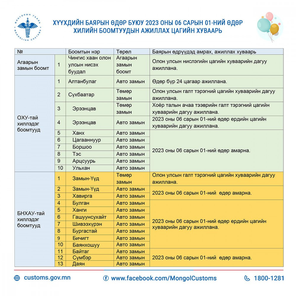 Өнөөдөр Олон улсын хүүхдийн эрхийг хамгаалах өдөр. Нийтээр тэмдэглэх баярын болон тэмдэглэлт өдрүүдийн тухайн хуулийн дагуу өнөөдөр бүх нийтээр амарч байгаа. Тэгвэл энэ өдөр хилийн боомтууд ямар цагийн хуваарийн дагуу ажиллах талаарх мэдээллийг хүргэж байна.