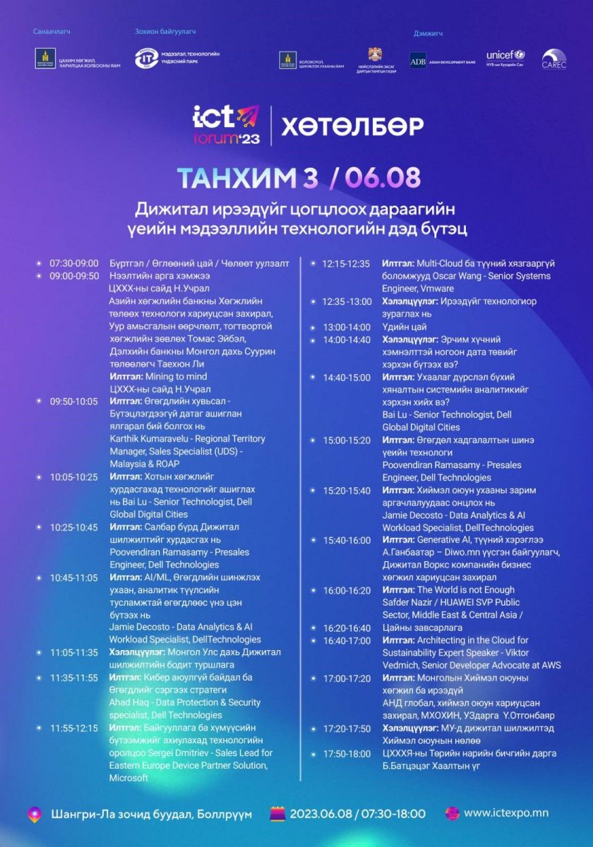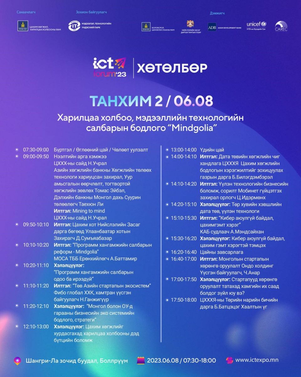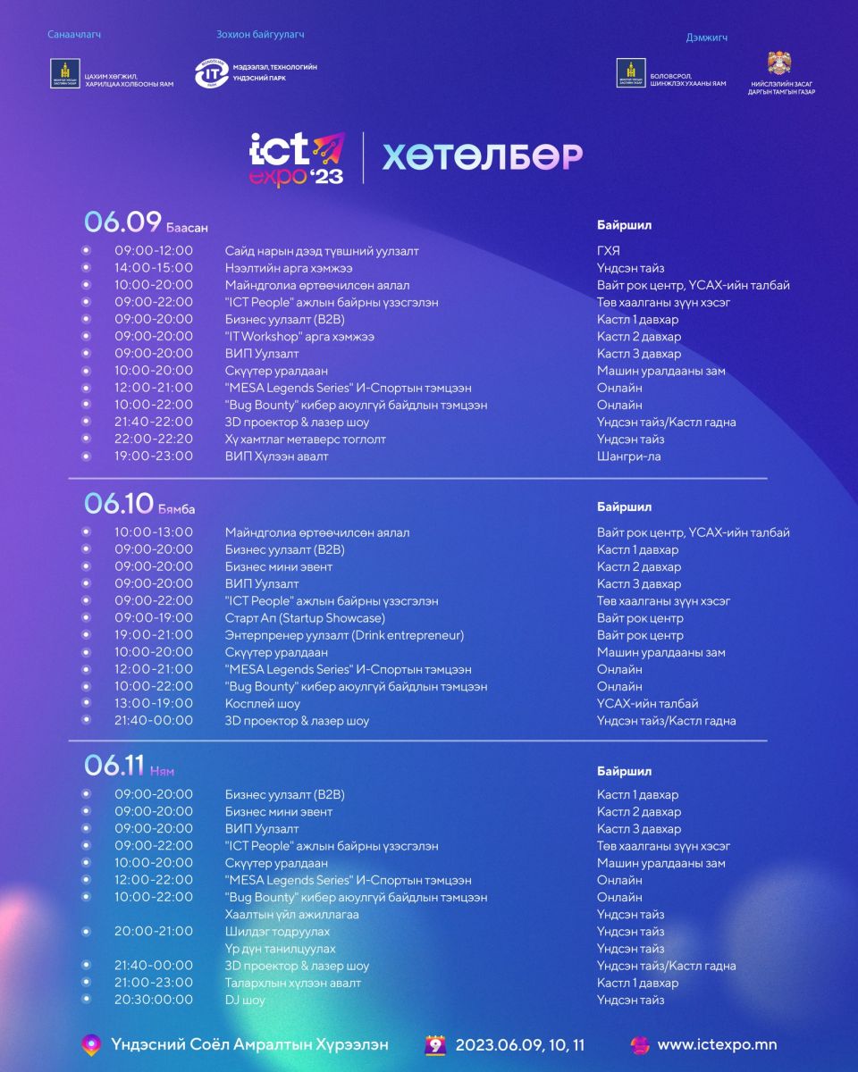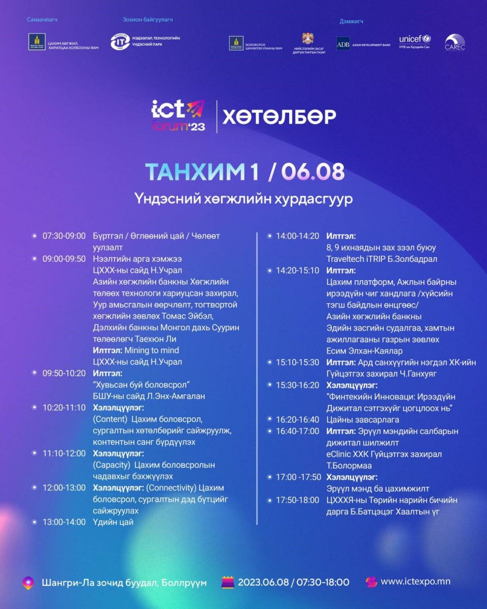 Харилцаа холбоо, мэдээлэл технологийн салбарын хамгийн том арга хэмжээ “ICT Expo 2023” энэ жил Үндэсний соёл амралтын хүрээлэнд зургаадугаар сарын 9-11-нд болно. Мөн энэ хүрээнд зургаадугаар сарын 8-нд тус салбарын өнгөрсөн, одоо, ирээдүйг хэлэлцэх, цаашид өсөн нэмэгдэх мэдээллийн технологийн салбарын ач холбогдол, бусад салбартай уялдаа холбоог хангах бодлогын илтгэл, хэлэлцүүлгүүд өрнөх форум болох юм.