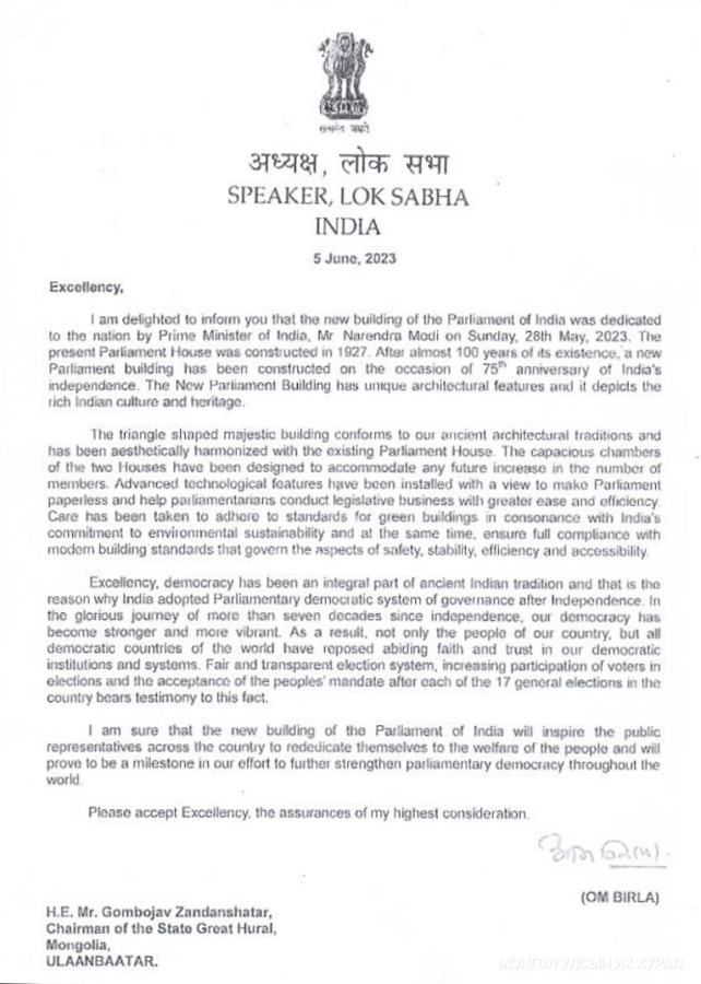 Монгол Улсын Их Хурлын дарга Г.Занданшатарт Бүгд Найрамдах Энэтхэг Улсын Лок Сабха-гийн (Парламентын доод танхим) дарга Ом Бирлагаас албан захидал ирүүлжээ.