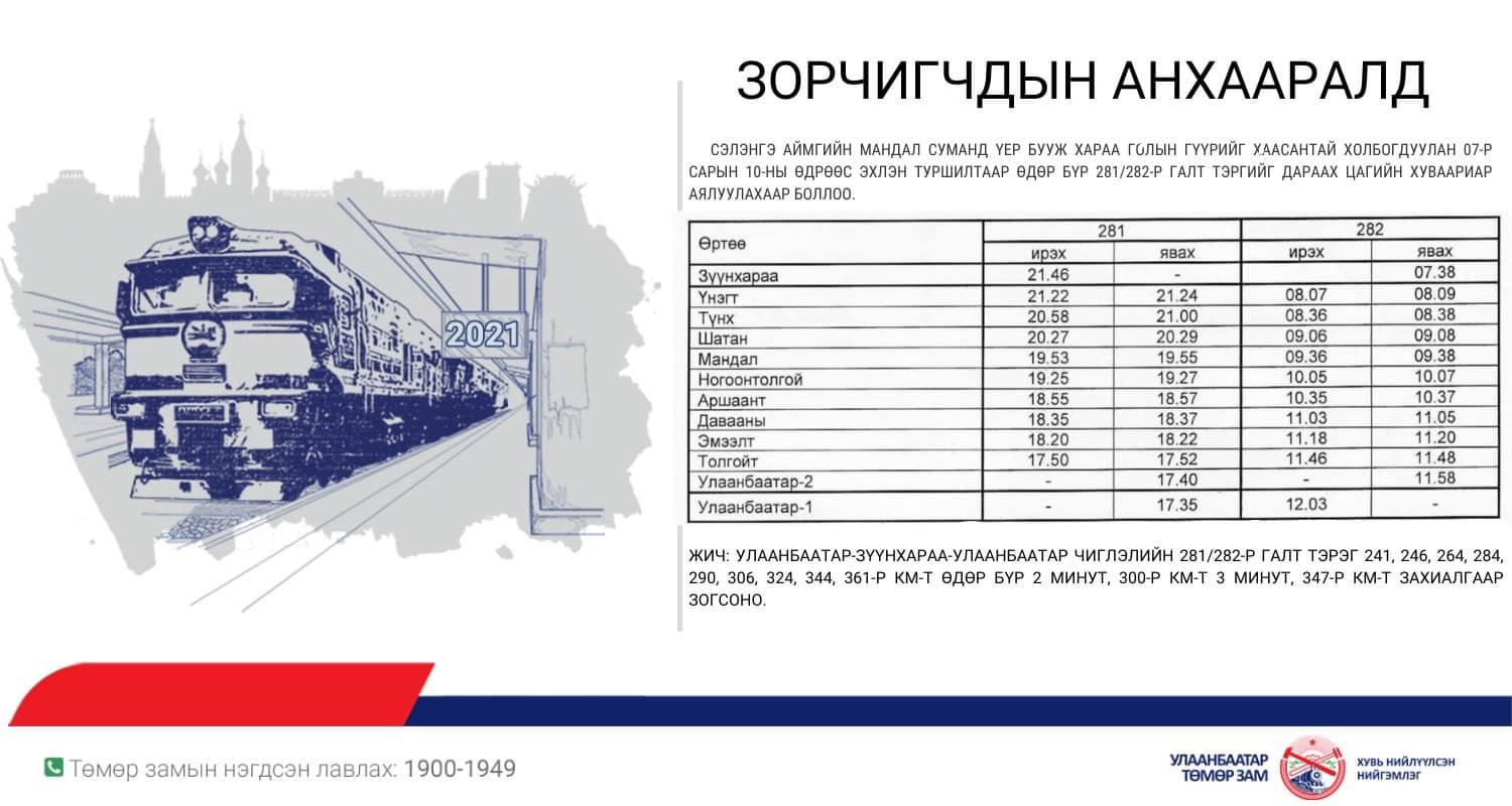 Сэлэнгэ аймгийн Мандал суманд үер бууж Хараа голын гүүрийг хаасантай холбогдуулан 07-р сарын 10-ны өдрөөс эхлэн туршилтаар өдөр бүр 281/282-р галт тэргийг дараах цагийн хуваариар аялуулахаар болжээ.