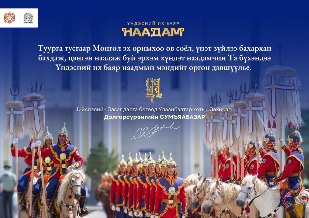 Дэлхийд мөртэй, түүхэнд нэртэй Монгол эх орныхоо үүх түүх, өв соёл, үнэт зүйлийг эрхэмлэн сахиж, монгол наадмынхаа ёс төрийг дээдэлж сайхан наадахыг хүсье.
