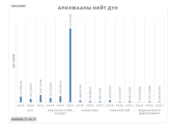 2021 оны эхний зургаан сарын арилжааны нийт дүнг харуулсан тул эдгээр таван компанийн хувьцааны арилжаа хагас жилийн дотор өмнөх жилүүдийн бүтэн жилийн дүнтэй ойролцоо зарим нь бүр давж гарсан болохыг графикаас харж болохоор байна. Тодорхой хэлбэл хагас жилийн дотор АПУ компанийн хувьцаа өмнөх оныхоос хоёр дахин, Ард Санхүүгийн нэгдэлийн хувьцаа өмнөх оныхоос 12 дахин их, Тавантолгой компанийн хувьцаа өмнөх оныхоо 34 хувиар тус тус илүү арилжигдсан байна.