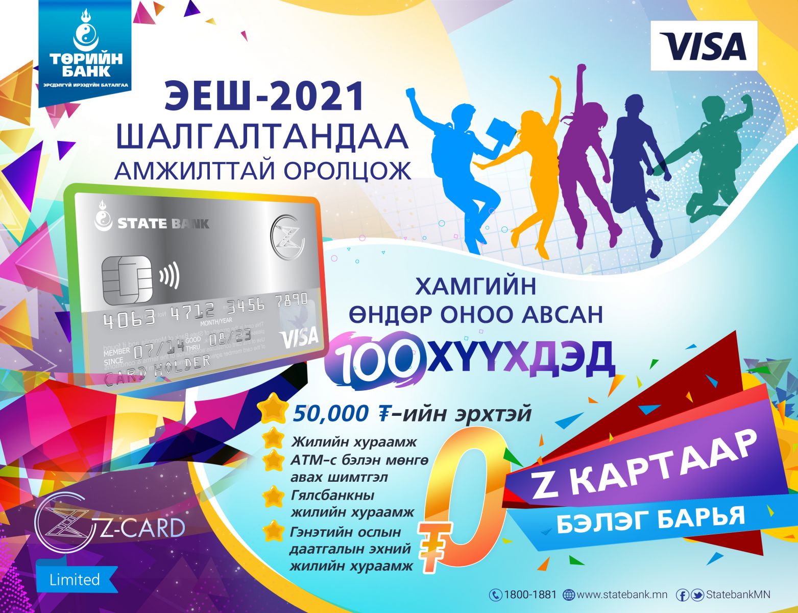 Төрийн банкнаас оюунлаг залуусаа дэмжих ажлыг 2014 оноос хойш тогтмол хийж байгаа бөгөөд энэ жилийн хувьд Элсэлтийн Ерөнхий шалгалтандаа хамгийн өндөр оноо авсан эхний 100 хүүхдэд тодорхой хэмжээний мөнгөн урамшууллын хамт “Z Карт”-аа үнэ төлбөргүй олгохоор болсон.