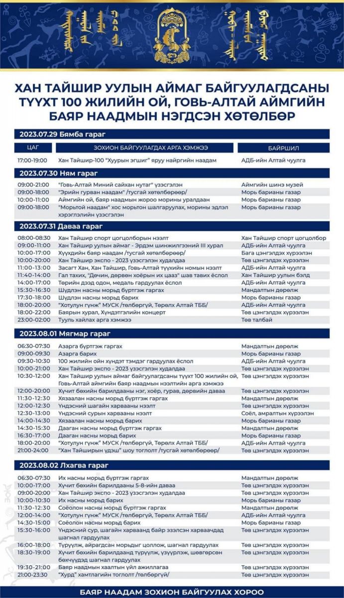 Баяр наадам 29-нд эхэлсэн бөгөөд өнөөдөр буюу 31-ний даваа гарагт Хан тайшир уулын аймаг -Эрдэм шинжилгээний III хурал, Хүүхдийн баяр наадам, Хан Тайшир экспо-2023 үзэсгэлэн худалдаа, шүдлэн насны морьдын уралдаан, хүндэтгэлийн концерт тоглогдож, ""Хотулун гүнж" УСК үнэ төлбөргүй гарна.