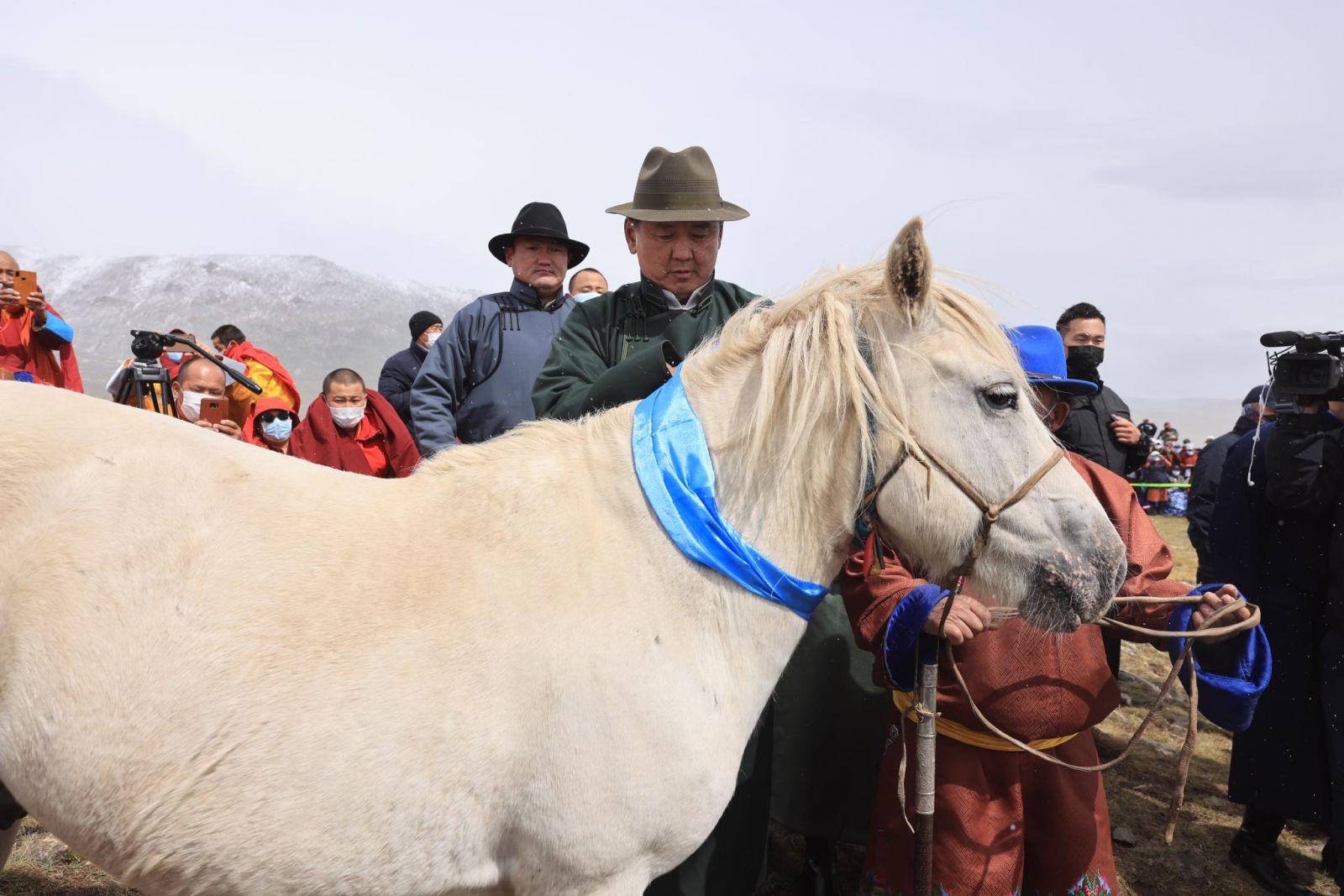 Монгол Улсын Ерөнхийлөгч тэнгэрт хүргэх дуут сумыг Монгол Улсын Гавьяат тамирчин, үндэсний сурын Дархан мэргэн, Зууны манлай харваач Ш.Даваахүүд хүлээлгэн өгч, Завхан аймгийн Отгон сумын харьяат, Аймгийн аварга малчин, Аймгийн алдарт уяач, Алтан унаганы эзэн Б.Дугаазааны адуун сүргээс сонгосон цагаан морийг тэнгэрийн хүлэг болгон сэтэрлэв. Ийнхүү Отгонтэнгэр хайрхан уулын тэнгэрийг тайх долоо дахь удаагийн төрийн тахилгын ёслол өндөрлөсөн юм.