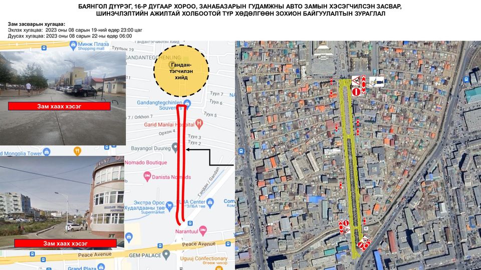 Баянгол дүүргийн 16-р хороо, Занабазарын гудамж /Гандантэгчэнлин Хийд/-ны авто замыг энэ сарын 19-ний 23:00 цагаас 22-ны 06:00 цагийн хооронд хааж, хэсэгчилсэн засвар, шинэчлэлтийн ажлыг хийж гүйцэтгэнэ.