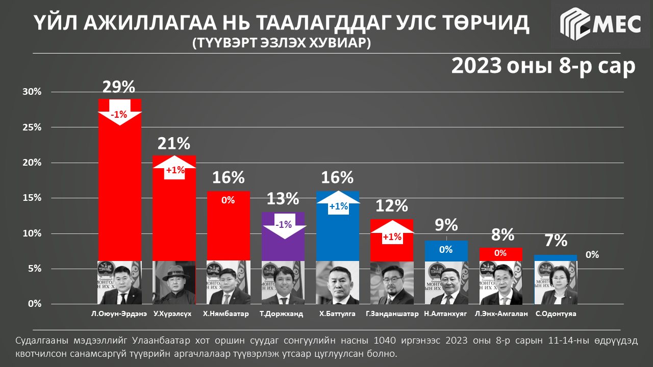 Харин дөрөвт УИХ-ын гишүүн Т.Доржханд, Тавт ЭКС Ерөнхийлөгч Х.Баттулга орсон байна. Тэгвэл УИХ-ын гишүүн, дэд дарга С.Одонтуяа "сүүл" мушгисан үзүүлэлттэй байна.