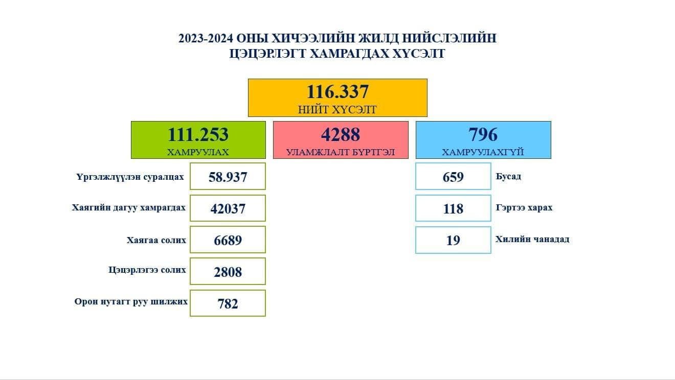 2023 оны наймдугаар сарын 1-нээс эхэлсэн цэцэрлэгийн бүртгэлд 116,337 хүсэлт иржээ. Үүнээс 111,253 хүүхэд цэцэрлэгт хамрагдах бөгөөд 783 хүүхэд орон нутаг руу шилжих бол 2,808 хүүхэд цэцэрлэгээ солих хүсэлт ирүүлсэн байна.