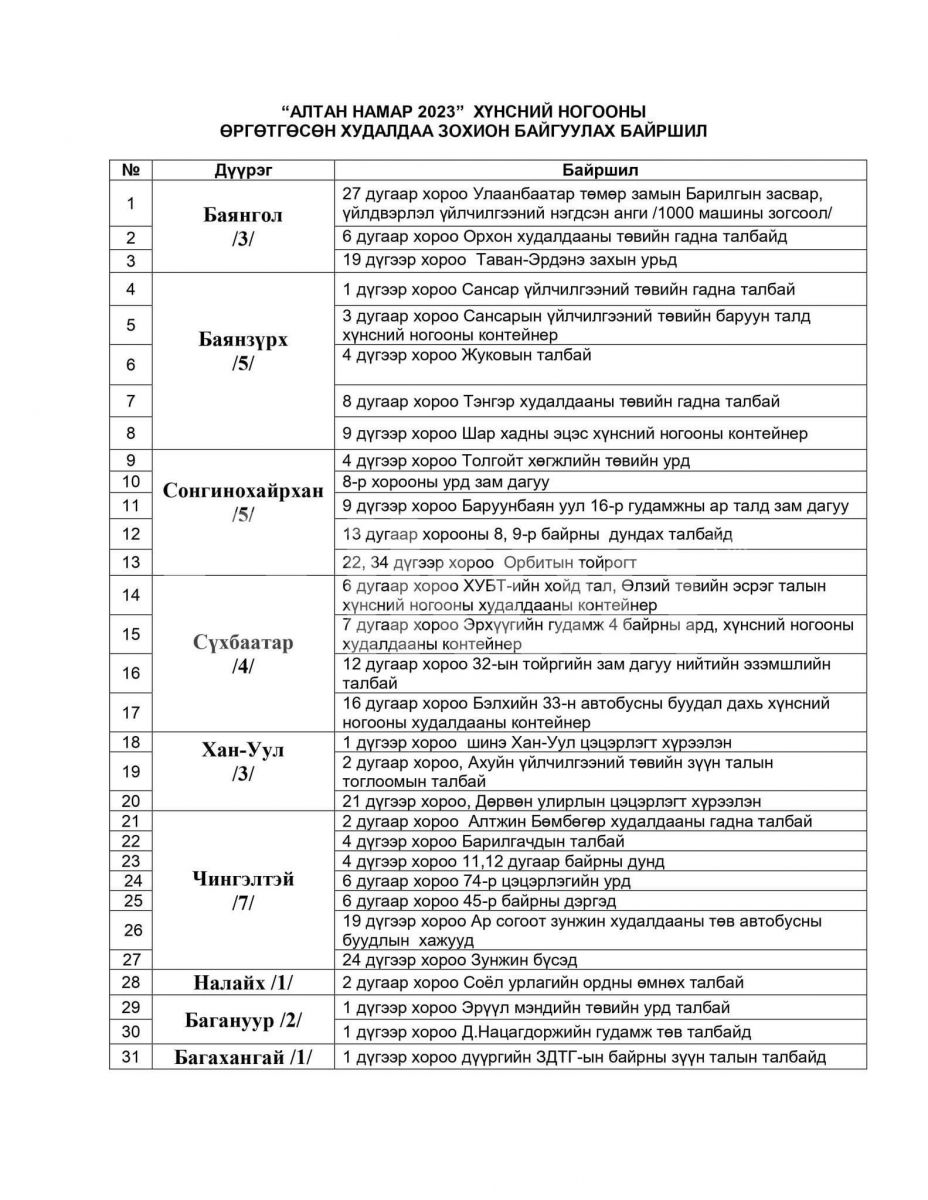 "Алтан намар 2023" хүнсний ногооны өргөтгөсөн худалдаа зохион байгуулагдаж буй байршлууд: