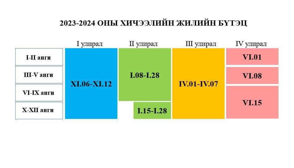Харин хичээлийн жилийн бүтцийг Боловсрол, шинжлэх ухааны сайд баталдаг. Тэгвэл сайдын 2023 оны наймдугаар сарын 23-ны өдрийн А/388 дугаар тушаалаар хичээлийн жилийн бүтцийг шинэчлэн баталлаа.