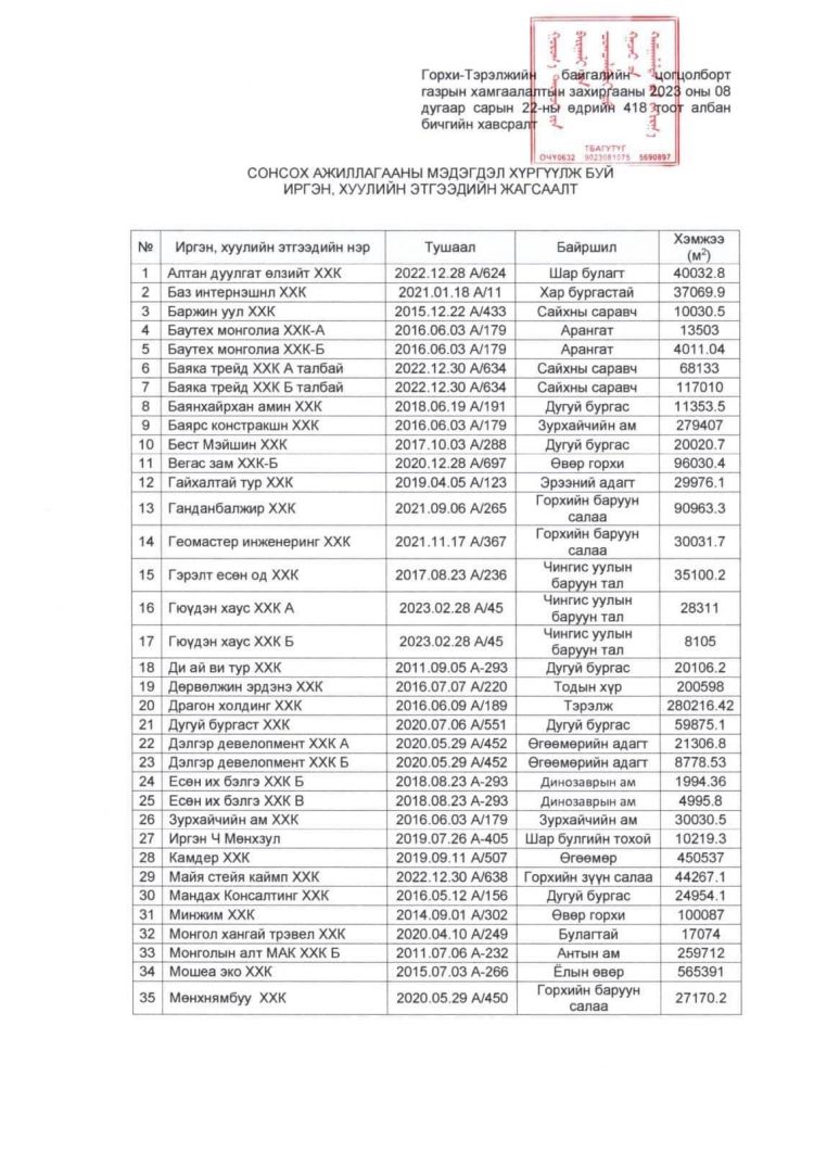 Горхи-Тэрэлжийн байгалийн цогцолборт газрын хязгаарлалтын бүсэд газар ашиглагч иргэн, аж ахуй нэгж байгууллагын газар ашиглалтын мэдээллийн санд Монгол Улсын “Усны тухай” хуулийн 22 дугаар зүйлийн 22.2-д “Усны сан бүхий газрын эргээс 50 метрээс доошгүй зайд болон гол мөрний татамд онцгой хамгаалалтын бүс тогтооно”, 22.2.1-д “Онцгой хамгаалалтын бүсэд барилга, байгууламж барих, газар хагалах, тэсэлгээ хийх, газар тариалан эрхлэх, ашигт малтмал хайх, олборлох, зэгс, шагшуурга, мод огтлох, элс, хайрга, чулуу авах, байгалийн ургамлыг үйлдвэрлэлийн зориулалтаар түүж бэлтгэх, мал угаах болон хөдөө аж ахуйн бүтээгдэхүүн үйлдвэрлэх цэг байгуулахыг хориглоно”, “Газрын тухай” хуулийн 33 дугаар зүйлийн 33.6-д “Усны сан бүхий газрын онцгой хамгаалалтын бүс болон ус хангамжийн эх үүсвэрийн эрүүл ахуйн бүсэд иргэн, хуулийн этгээдэд газар ашиглуулах, эзэмшүүлэхийг хориглоно”, “Тусгай хамгаалалттай газар нутгийн тухай” хуулийн 39 дүгээр зүйлийн 39.1.2-д заасан байгалийн цогцолборт газрын хамгаалалтын нийтлэг горимыг тус тус зөрчсөн нь тогтоогдож байна.