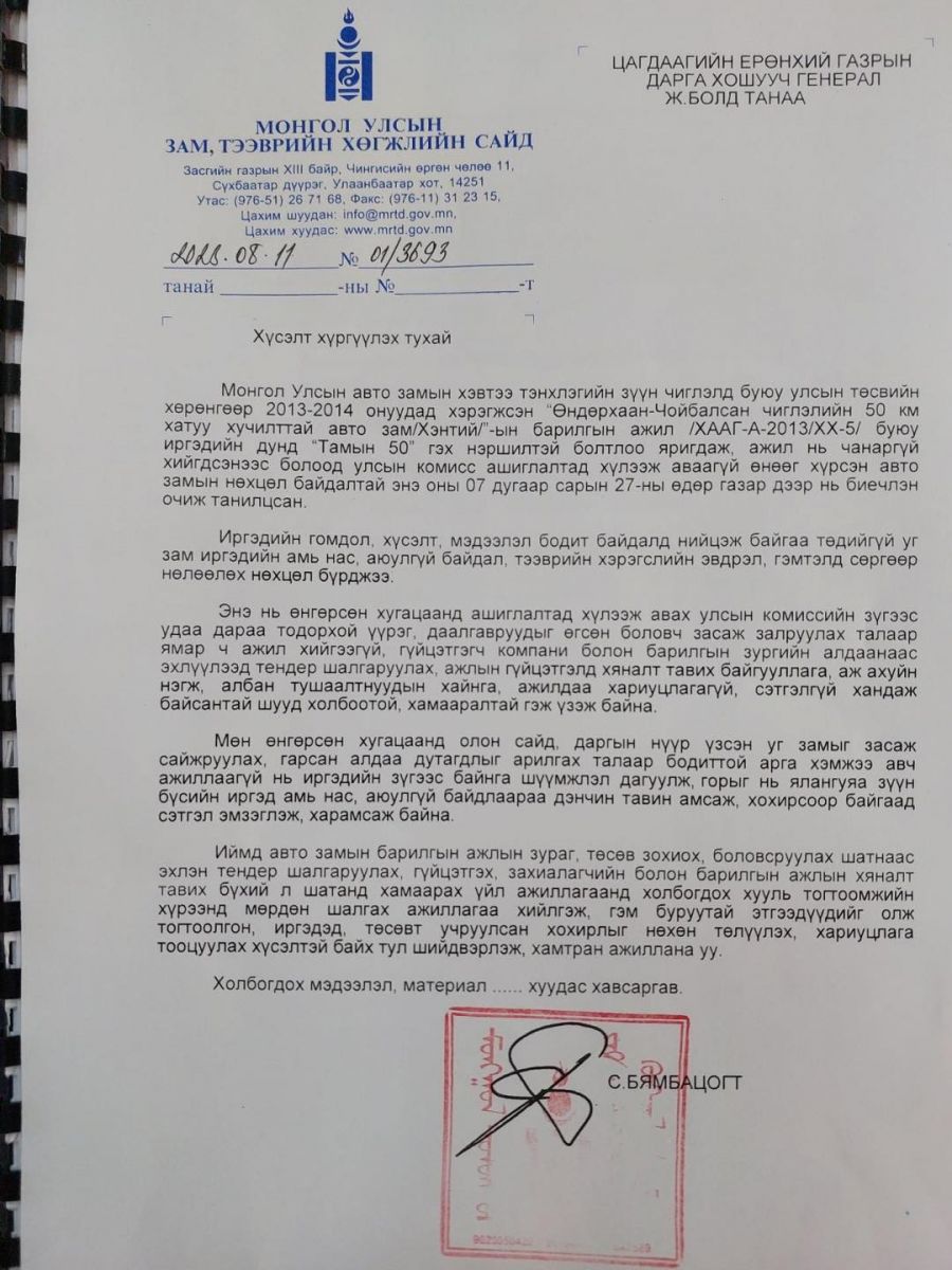 Иргэдийн амь нас эрүүл мэнд, эд хөрөнгөд ноцтой аюул занал учруулж буй уг замын гүйцэтгэгч компани, тендер шалгаруулах ажлыг зохион байгуулсан болон хяналт тавих үүргээ биелүүлээгүй бүх этгээдийг шалгуулахаар Цагдаагийн байгууллагад хандлаа.