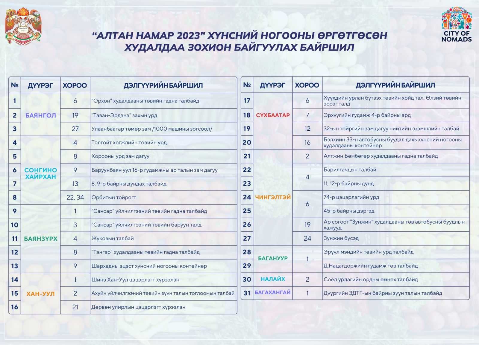 Хөдөө аж ахуйн бүтээгдэхүүний үйлдвэрлэл, борлуулалтын сүлжээг нэмэгдүүлэх, нийслэлийн иргэдийг шинэ ургацын төмс, хүнсний ногоогоор хангах “Алтан намар 2023” хүнсний ногооны өргөтгөсөн худалдааг нийслэлийн 31 байршилд зохион байгуулахаар төлөвлөсөн.