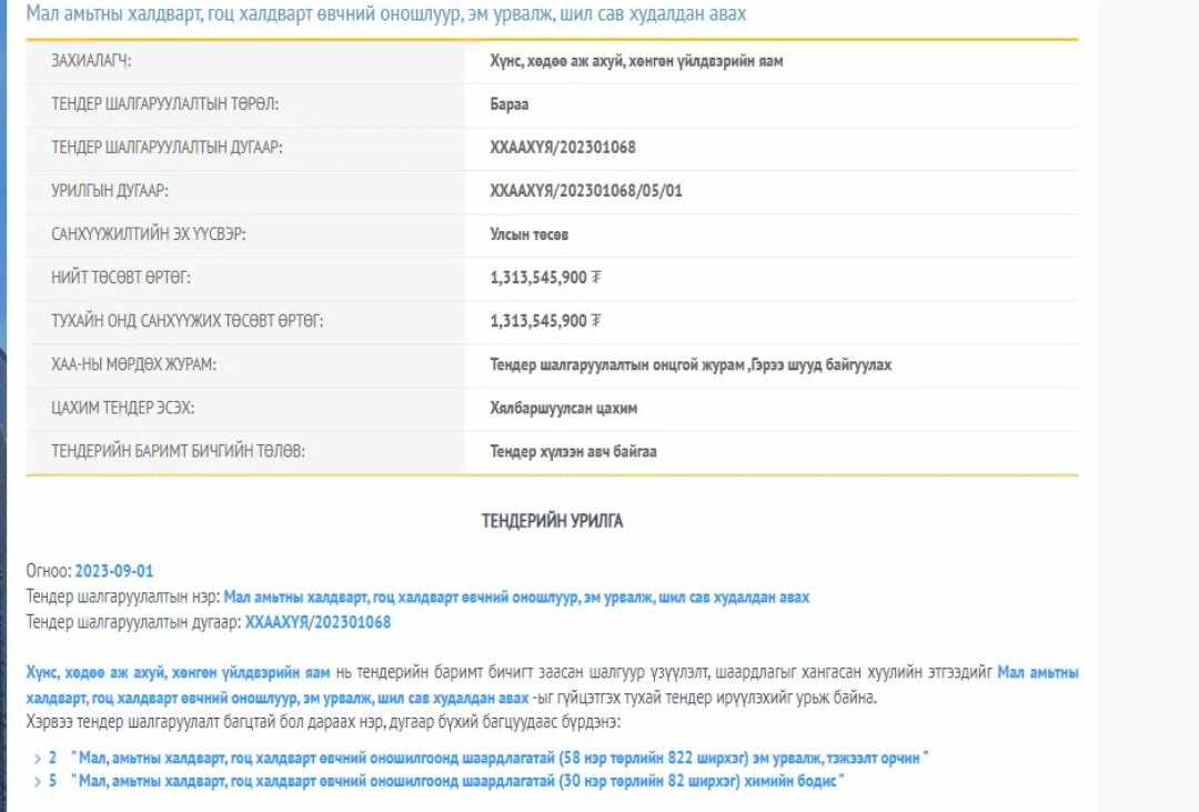 Төрийн худалдан авах ажиллагааны цахим систем дэх ОНЦЛОХ "тендер"-ийг хүргэж байна. Тодруулбал, Х.Болорчулуунаар толгойлуулсан ХХААХҮЯ "Мал амьтны халдварт, гоц халдварт өвчний оношлуур, эм урвалж, шил сав худалдан авах" 1 тэрбум 313 сая 545 мянга 900 төгрөгийн ТЕНДЕР зарлажээ. Тухайлбал,