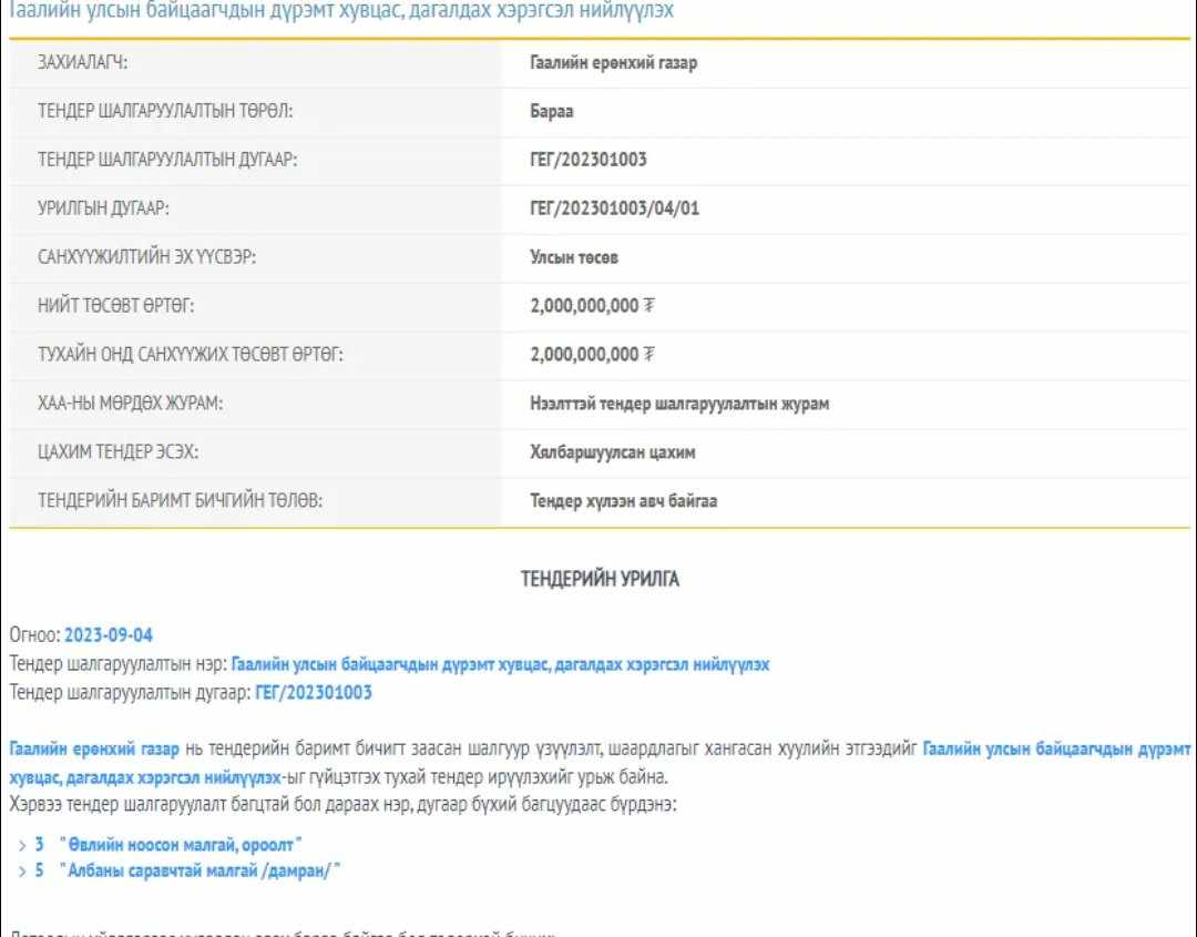 Бид "Төрийн худалдан авах ажиллагаа"-ны цахим системд байршсан онцлох ТЕНДЕР-үүдийг хүргэж байгаа. Энэ удаа ГЕГ-аас өчигдөр /2023.09.04/ зарласан 2 ТЭРБУМ төгрөгийн ТЕНДЕР-ийг онцолж байна. Тодруулбал,