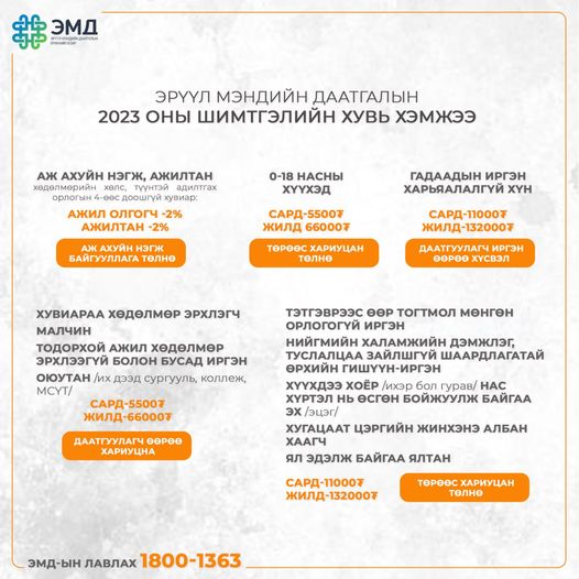 ЭМД-ын шимтгэлийн хувь хэмжээг ЭМДЕГ-аас танилцуулллаа. Тодруулбал, 0-18 насны хүүхдийн ЭМД-ийг төрөөс хариуцна. Хувиараа хөдөлмөр эрхлэгч, малчин, тодорхой ажил эрхлээгүй болон бусад иргэн, оюутан ЭМД-ийг өөрөө хариуцна.