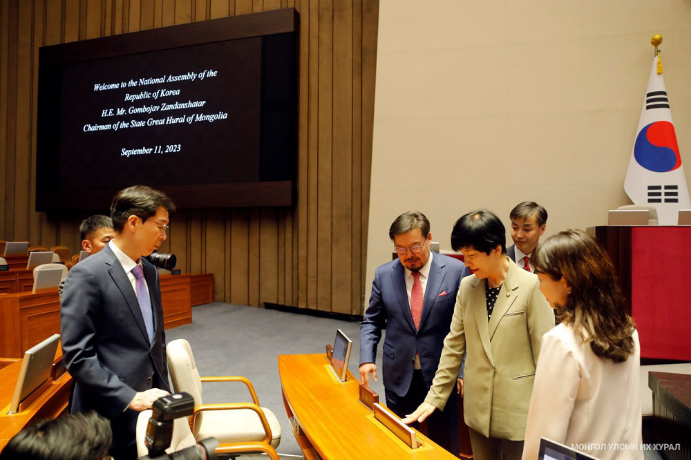 Улсын Их Хурлын дарга Г.Занданшатар өнөөдөр (2023.09.11) БНСУ-ын Үндэсний Ассамблейн дэд дарга хатагтай Ким Ён Жү-тэй уулзлаа.