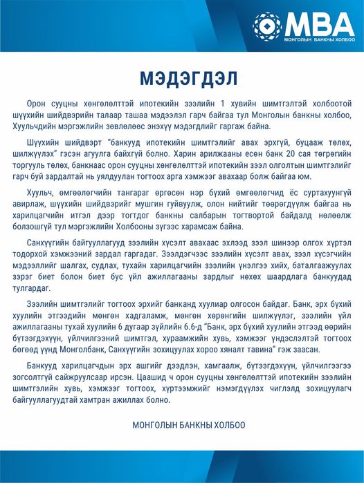 Дээд шүүхээс "Арилжааны банкууд ипотек зээл авсан харилцагчдад зээлийн "НЭГ ХУВЬ"-ийн шимтгэлийг буцаан олгох" шийдвэр гарсан талаар мэдээлсэн. Тэгвэл үүнтэй холбоотойгоо Монголын Банкны холбооноос МЭДЭГДЭЛ гаргалаа. Мэдэгдэлд: