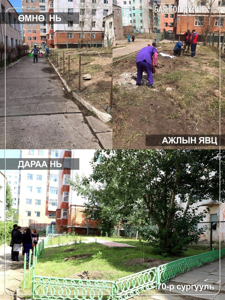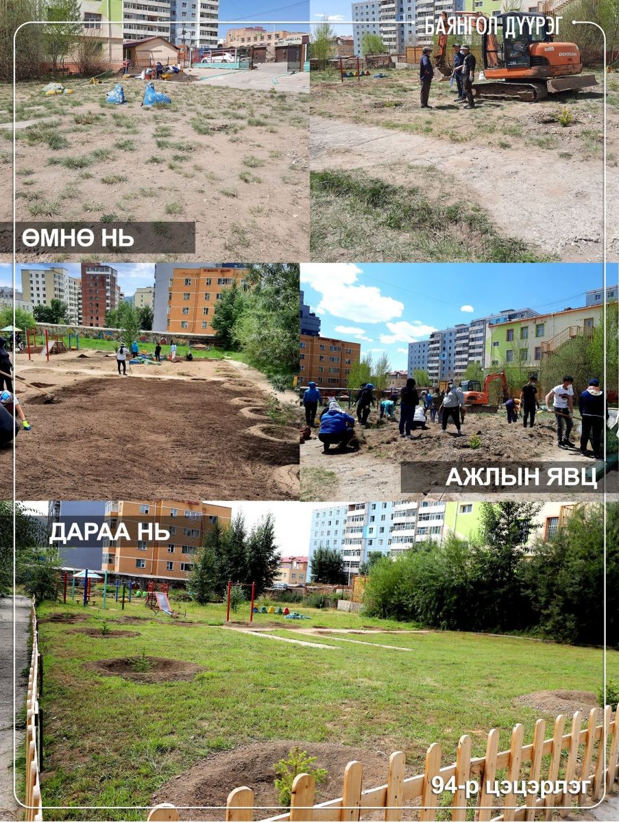 Тэгвэл энэ жил туршлага болгон өөрсдийн нөөц боломжид тулгуурлаж хийсэн ажил үр дүнгээ өгч эхэлжээ. Иймд энэ онд 5 сургууль /ЭУЦС, ОУЦС, 13, 47, 70 дугаар сургууль, 10 цэцэрлэг /1, 15, 47, 57, 88, 94, 96, 114, 198, 278 дугаар цэцэрлэг/ хашааг зүлэгжүүлсэн бол ирэх жилүүдэд улам чанаржуулж, дүүргийн хэмжээнд үйл ажиллагаа явуулдаг бүх сургууль, цэцэрлэг буюу ерөнхий боловсролын 19 сургууль, 37 цэцэрлэгийн хашааг бүрэн зүлэгжүүлэхээр болжээ.