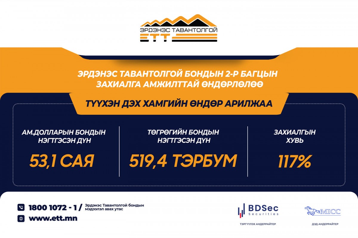 Хөрөнгө оруулагчдын анхаарлын төвд байсаар байгаа “Эрдэнэс Тавантолгой” ХК-ийн хариуцан хэрэгжүүлж байгаа төслүүдийг санхүүжүүлэх зорилгоор нийт зарласан ЭТТ Бондын II шатны эхний захиалга амжилттай дууслаа.