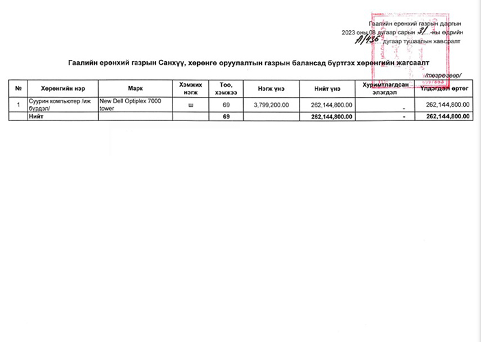 Харин энэ удаад 262.1 сая төгрөгөөр "Dell" брэндийн 69 ширхэг суурин компьютер авах тушаал гаргасныг нь дэлгэж байна.