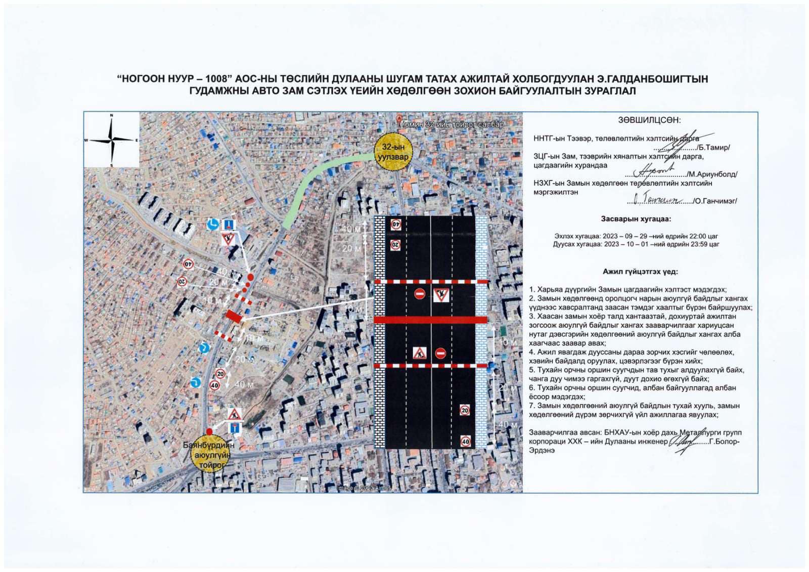 БНХАУ-ын буцалтгүй тусламжаар хэрэгжиж буй “НОГООН НУУР-1008 АЙЛЫН ОРОН СУУЦ” төслийн гадна дулааны шугамын ажлыг есдүгээр сарын 29-өөс аравдугаар сарын 1-ний өдрүүдэд хийж гүйцэтгэх тул түр хугацаанд зам хаахаар болжээ. Тодруулбал,