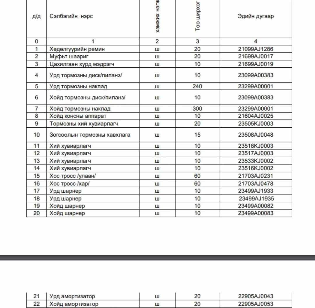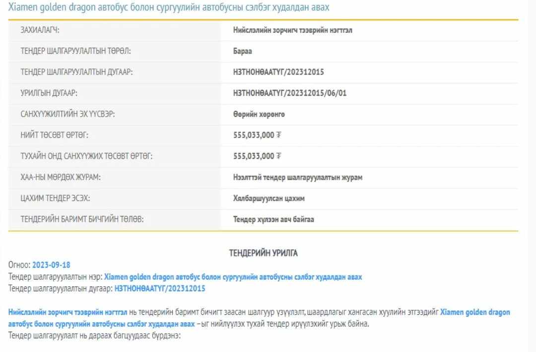 Тэгвэл улаан автобуснуудыг хүлээн авсан төрийн өмчит хоёр байгууллагын нэг болох Нийслэлийн "Зорчигч тээврийн нэгтгэл" ОНӨААТҮГ нь 555 сая төгрөгөөр сэлбэг хэрэгсэл авах ТЕНДЕР зарласан байх юм. Үүнийг задалж үзвэл дараах байдлаар сэлбэг хэрэгслийн тоо хэмжээг заажээ.